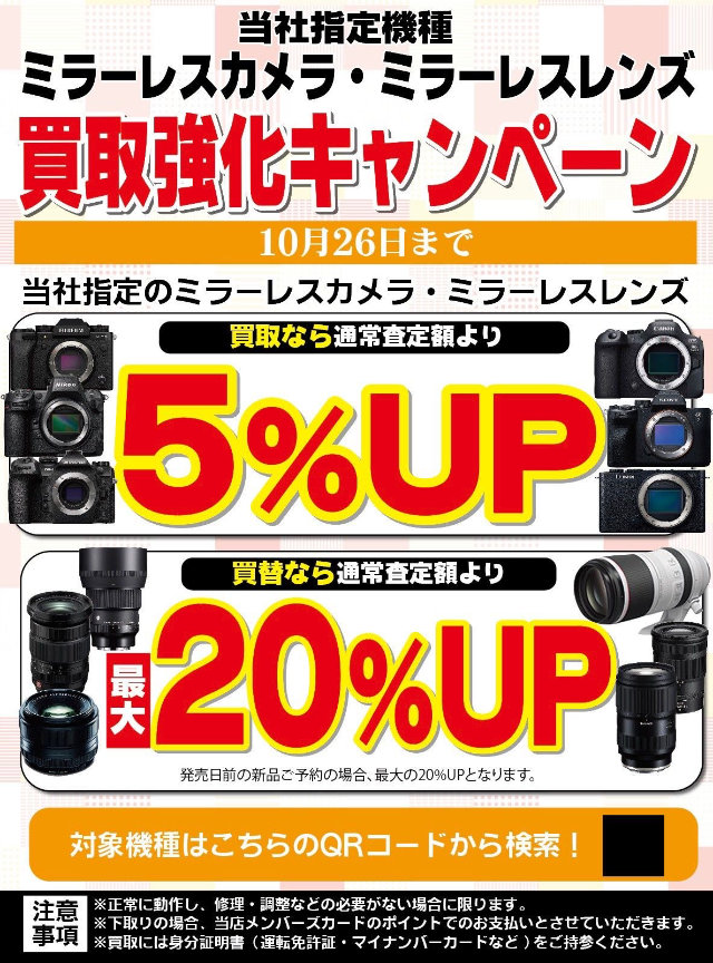 現金買取5%UP買替下取りなら最大20%UP!当店指定機種のミラーレスカメラ・レンズを大幅アップで買取&買替下取りいたします! 高額買取価格サーチはこちら 指定機種一覧はこちら |