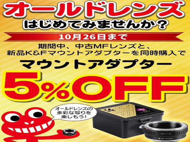 同時購入でマウントアダプターがお得!中古MFレンズと同時購入でK&Fマウントアダプターを5%割引いたします!トップカメラでオールドレンズを探してみませんか? |