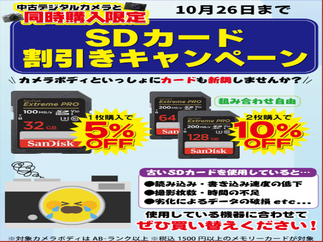 同時購入でSDカードがお得!中古カメラと同時購入でSDカードを5%割引いたします!さらに2枚以上お買い上げの場合は、なんと10%割引いたします!まとめ買いのチャンスです! |